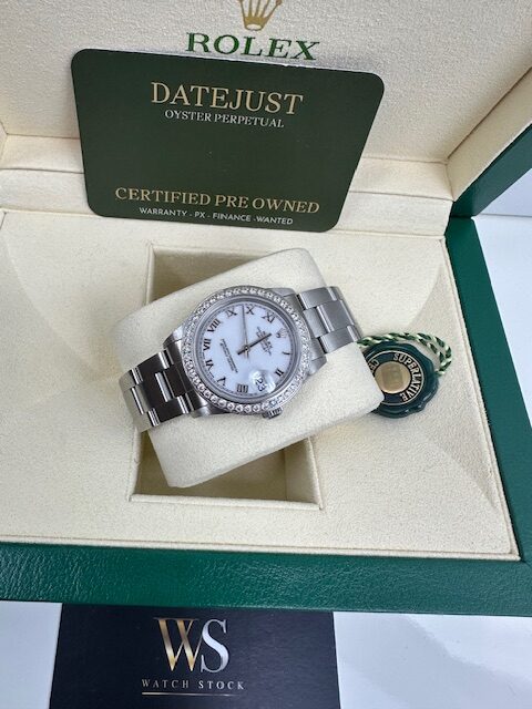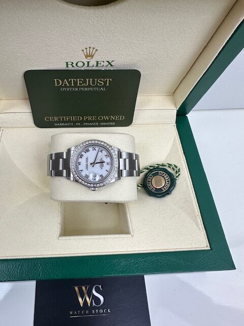 OYSTER BRACELET STONE SET BEZEL, AND FACTORY COIN ,ROLEX WHITE ROMAN DIAL,