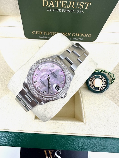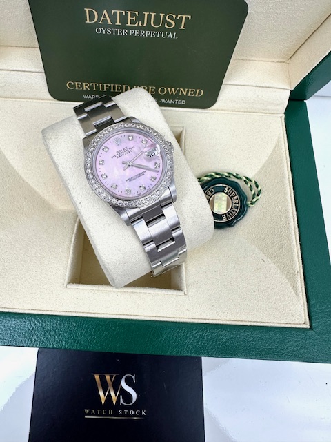 OYSTER BRACELET STONE SET BEZEL, PINK MOTHER OF PEARL DIAL,