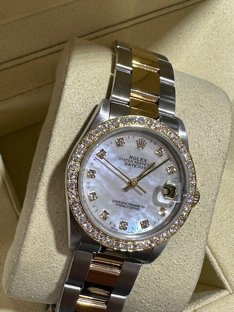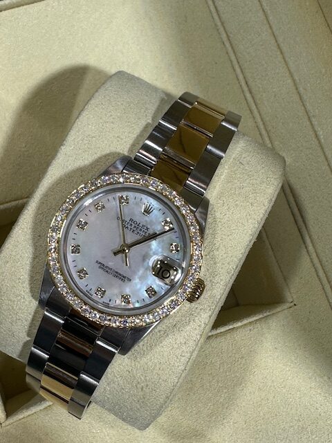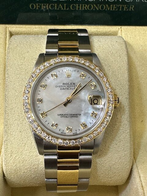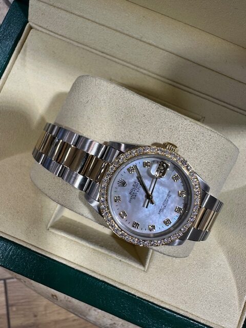 RARE OYSTER BRACELET WITH DIAMOND SET BEZEL , WITH MOTHER OF PEARL STONE SET CUSTOM DIAL