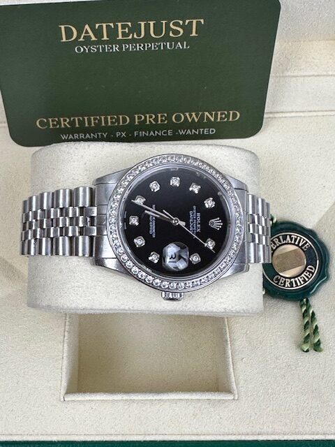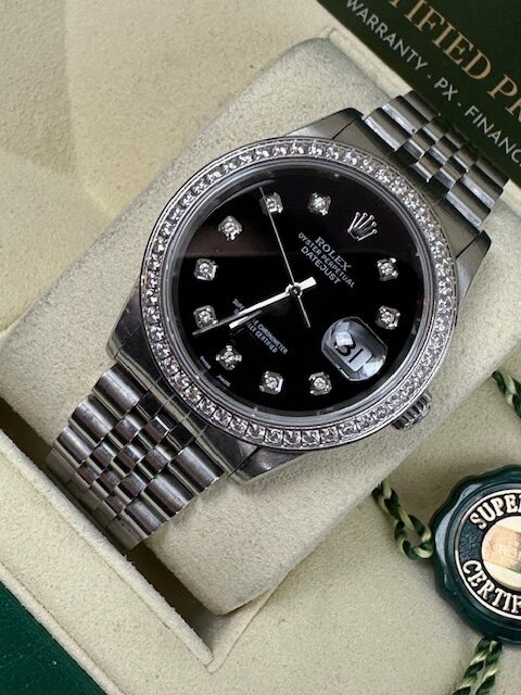 ROLEX CUSTOM DATEJUST 36MM WITH BOX RECEIPT AND CERTIFICATES , SUPERB CONDITION , JUBILEE BRACELET , STUNNING CUSTOM BLACK DIAL AND STONE SET BEZEL , LOOKS GREAT FEW OF THESE AVAILABLE DIFFERENT DIAL CHOICES