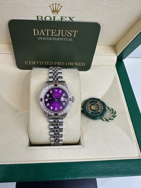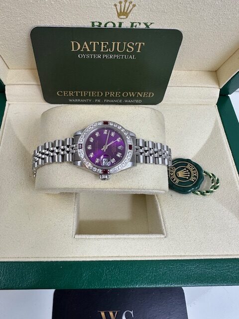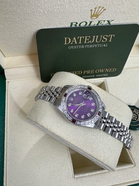 LADIES STAINLESS STEEL DATEJUST 26MM SET WITH BOX ROLEX PAPERS AND ID CARD NATIONAL CERTIFICATES, PURPLE CUSTOM DIAL STONE SET BEZEL ,