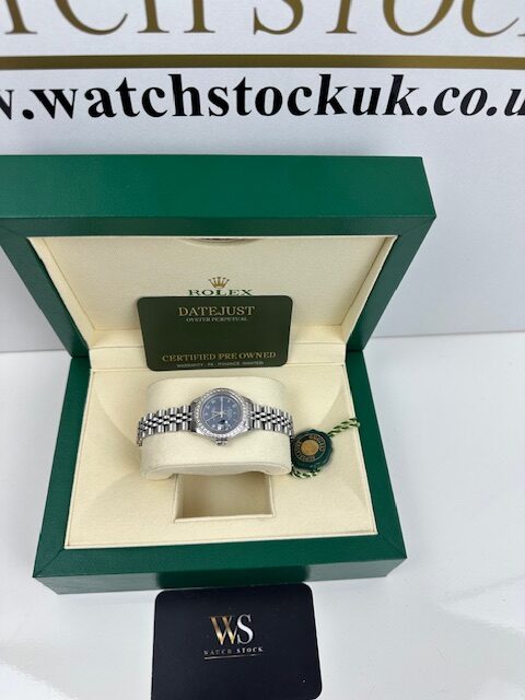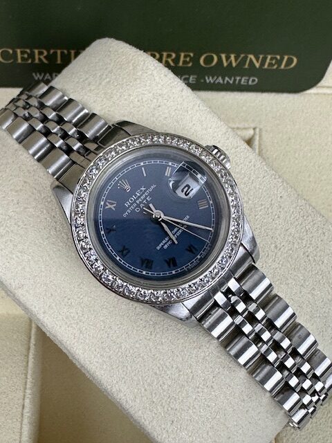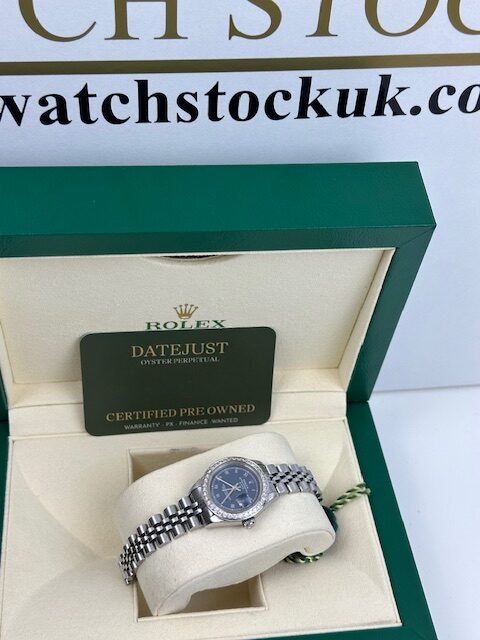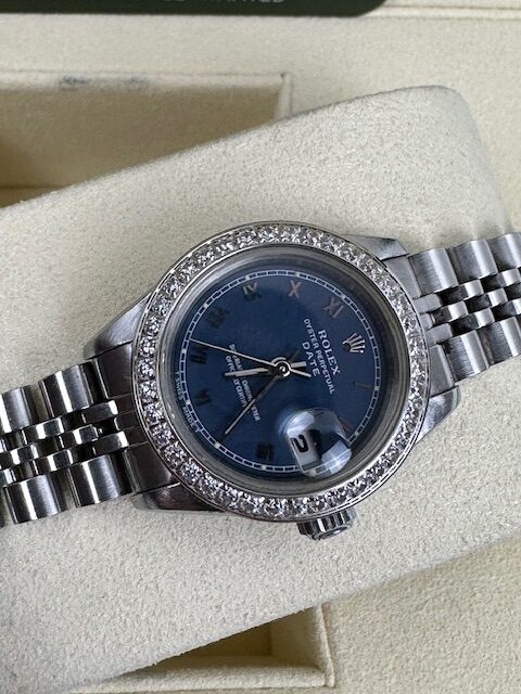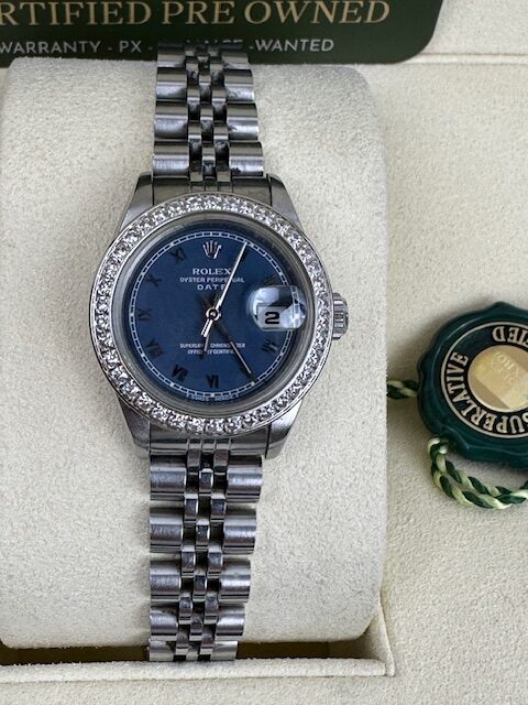 LADIES STAINLESS STEEL OP DATE 26MM SET WITH BOX AND ROLEX SERVICE PAPERS ID CARD NATIONAL CERTIFICATES, BLUE ROMAN FACTORY DIAL STONE SET BEZEL ,