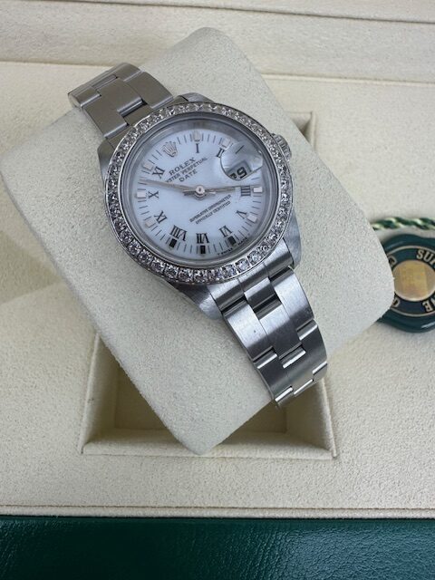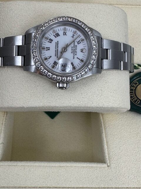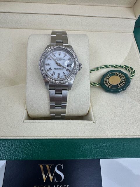 LADIES STAINLESS STEEL DATEJUST 26MM SET WITH BOX ROLEX PAPERS AND ID CARD NATIONAL CERTIFICATES, WHITE ROMAN DIAL STONE SET BEZEL ,