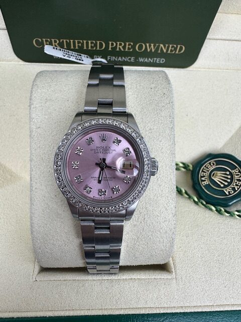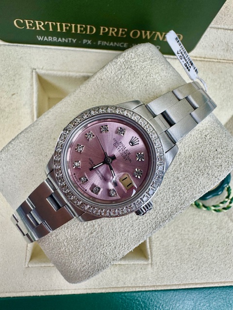 LADIES STAINLESS STEEL OP DATEJUST 26MM SET WITH BOX ID CARD NATIONAL CERTIFICATES, CUSTOM PINK DIAL STONE MATCHING BEZEL ,