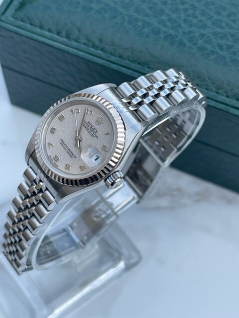 LADIES STAINLESS STEEL DATEJUST 26MM WITH FLUTED BEZEL AND MATCHING ROLEX FACTORY DIAL WITH BOX ID CARD AND NATIONAL CERTIFICATES, AND WR CERTIFICATES , JUBILEE BRACELET