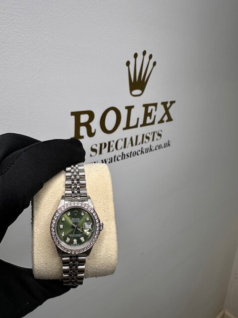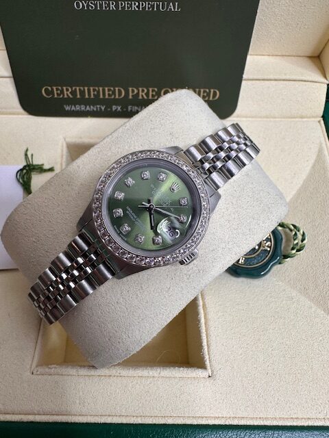 LADIES FULL SET STAINLESS STEEL DATE 26MM CUSTOM SET WITH STONE BEZEL AND MATCHING OLIVE GREEN DIAL
