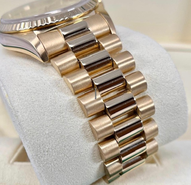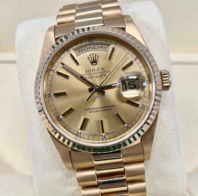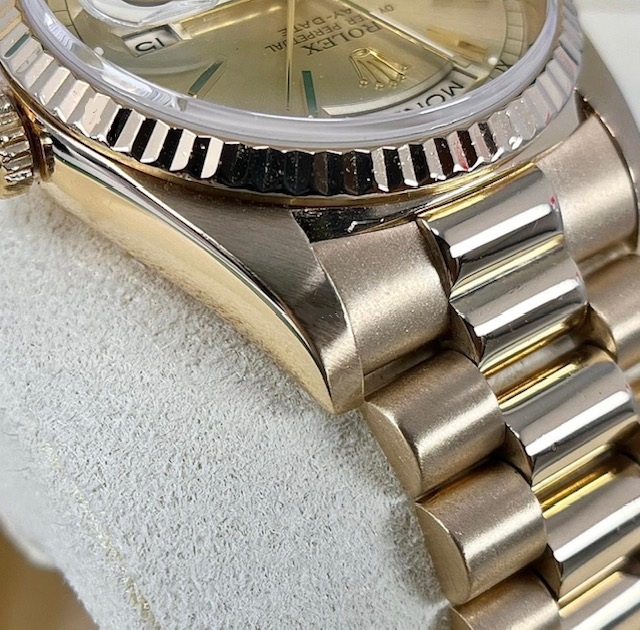 ROLEX DAYDATE 18038 18K 36mm, PRESIDENT BRACELET , STUNNING FACTORY CHAMPAGNE DIAL. MATCHING FLUTED BEZEL FULLY PRESENTED WITH BOX ID CARD ROLEX BOOKLETS, RECEIPTS BOOKLETS TAGS A WATCH REGISTER REPORT AND DETAILED VALUATION / AUTHENTICY CERTIFICATE.