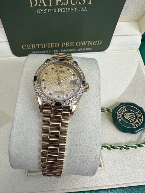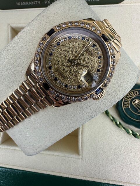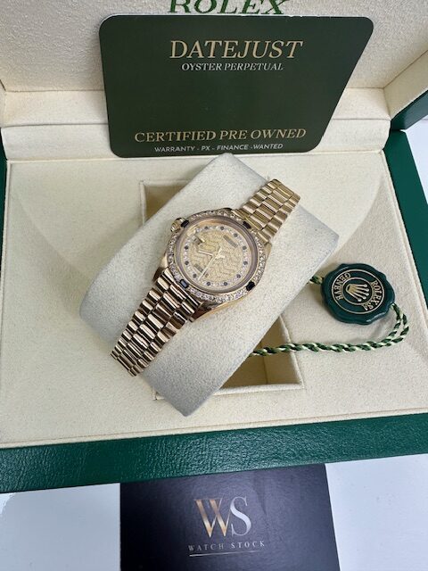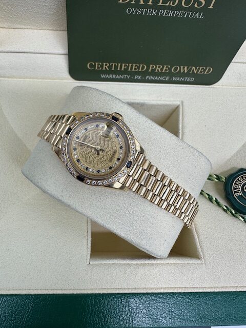 DIAMOND SET LADIES DATEJUST 26MM A SUPERB ROLEX FULL YELLOW GOLD ON A PRESIDENT BRACELET , RARE PAVE STRING DIAMOND AND SAPPHIRE DIAL WITH MATCHING DIAMOND AND SAPPHIRE BEZEL