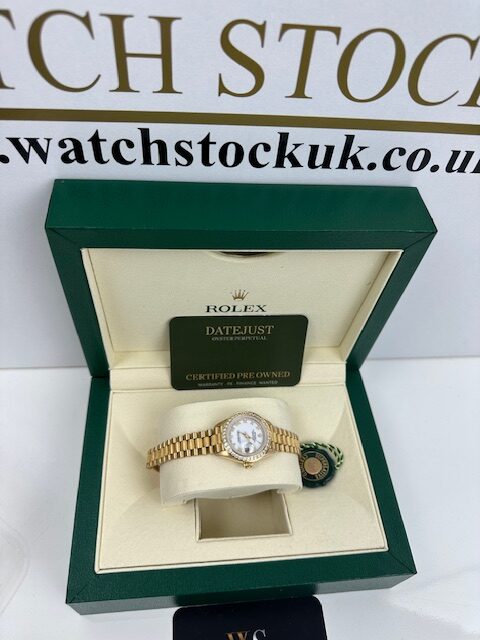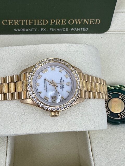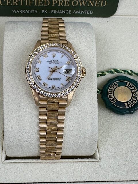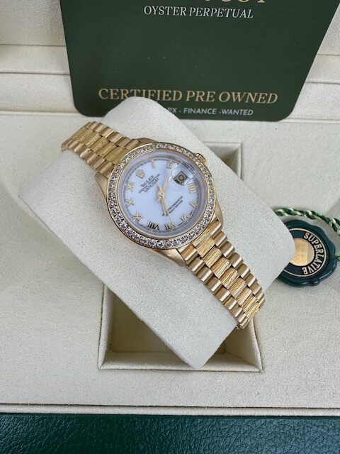 18K LADIES DATEJUST A SUPERB ROLEX 26MM FULL YELLOW GOLD ON AN IMMACULATE PRESIDENT BARK BRACELET, WHITE ROMAN DIAL 26MM, COMES WITH STONE SET BEZEL ,