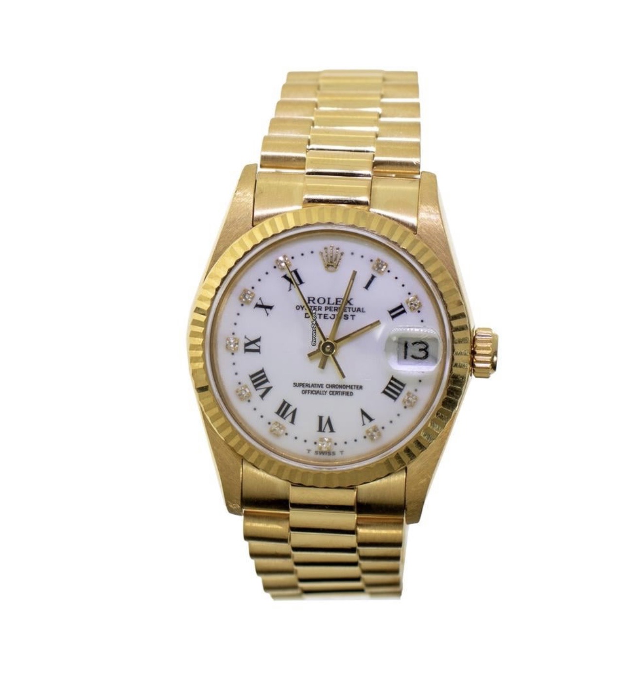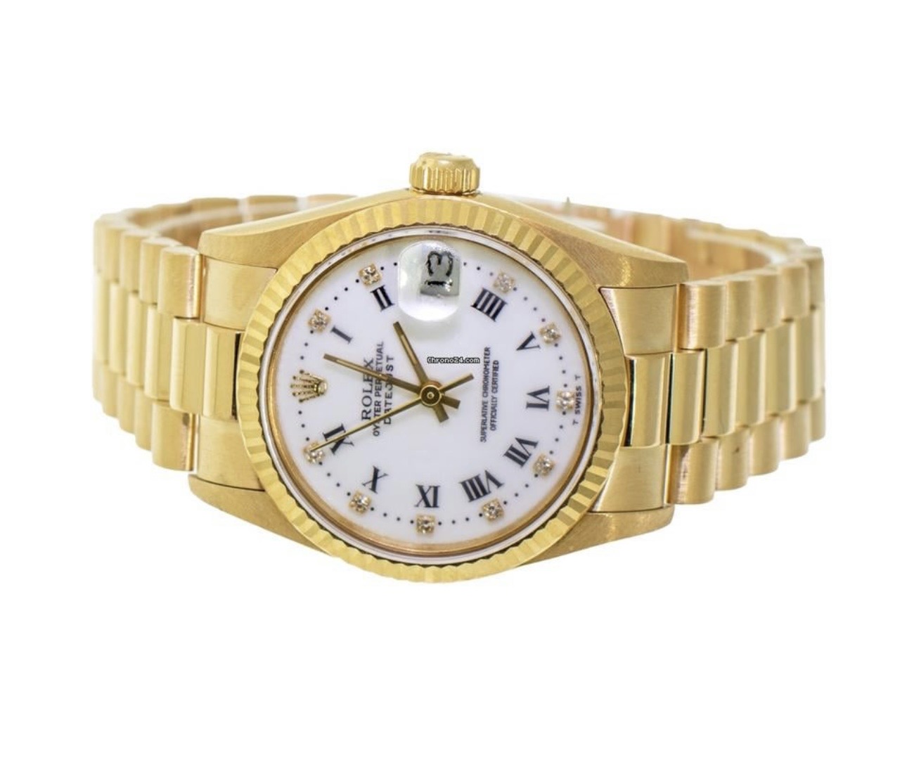 ROLEX DATEJUST 68278 18K 31mm, PRESIDENT BRACELET , STUNNING ROLEX WHITE DIAMOND DIAL , FLUTED OR OPTIONAL STONE BEZEL.FULLY PRESENTED WITH BOX NATIONAL CERTIFICATES RECEIPTS BOOKLETS TAGS A WATCH REGISTER REPORT AND DETAILED VALUATION / AUTHENTICY CERTIFICATE