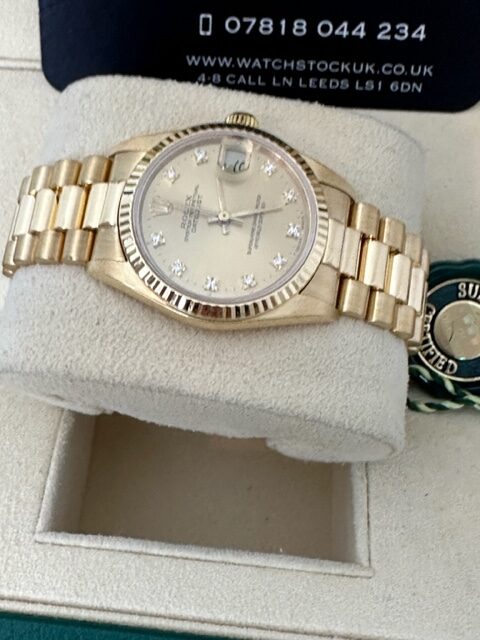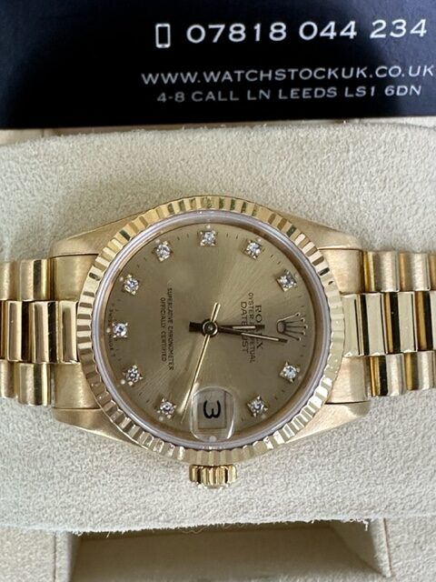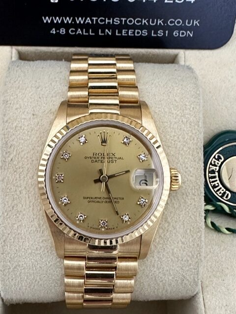 ROLEX DATEJUST 68278 18K 31mm, PRESIDENT BRACELET , STUNNING ROLEX CHAMPAGNE DIAMOND DIAL , FLUTED OR OPTIONAL STONE BEZEL.FULLY PRESENTED WITH BOX ID CARD CERTIFICATES RECEIPTS BOOKLETS TAGS A WATCH REGISTER REPORT AND DETAILED VALUATION / AUTHENTICY CERTIFICATE