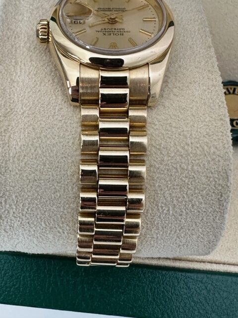 LADIES DATEJUST JUST A VERY RARE SUPERB ROLEX FULL 18K YELLOW GOLD ON THE LATER HEAVY PRESIDENT BRACELET WITH HIDDED CLASP, ROLEX CHAMPAGNE DIAL WITH CHOICE OF SMOOTH OR FLUTED 18K BEZEL 26MM