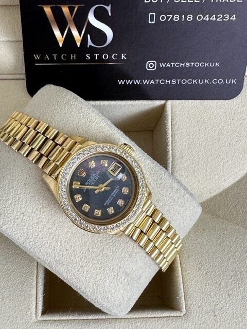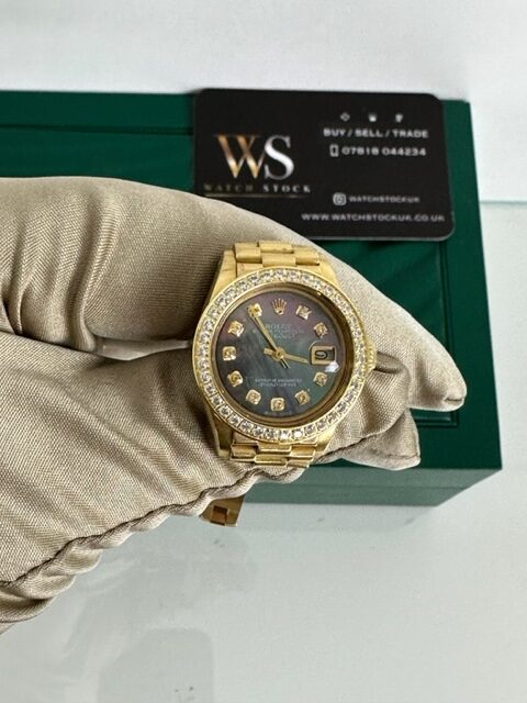 LADIES DATEJUST FULL GOLD JUST A SUPERB ROLEX FULL 18K YELLOW GOLD ON A PRESIDENT BRACELET, BLACK MOTHER OF PEARL DIAMOND DIAL, FLUTED OR STONE BEZEL OPTION 26MM , OTHER DIAL OPTIONS POSSIBLE