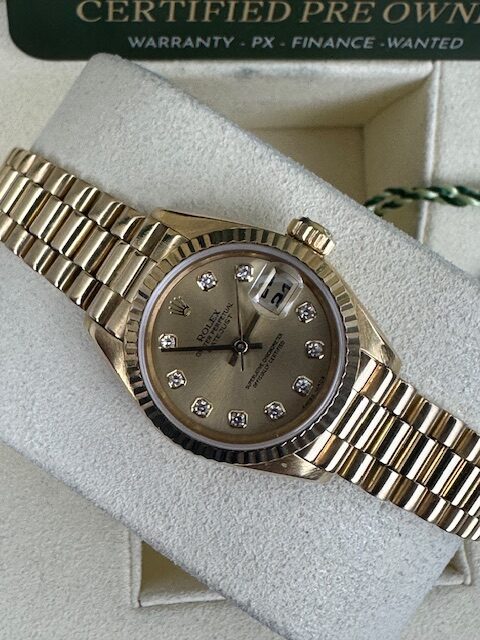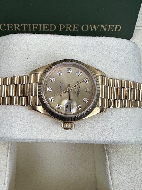 LADIES DATEJUST JUST A SUPERB ROLEX FULL 18K YELLOW GOLD ON A PRESIDENT BRACELET, CHAMPAGNE CUSTOM STONE SET DIAL, 26MM , COMES WITH 18K FLUTED BEZEL