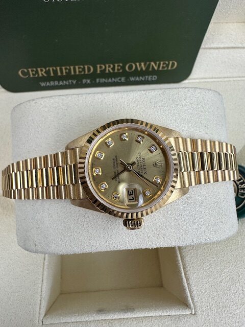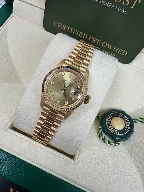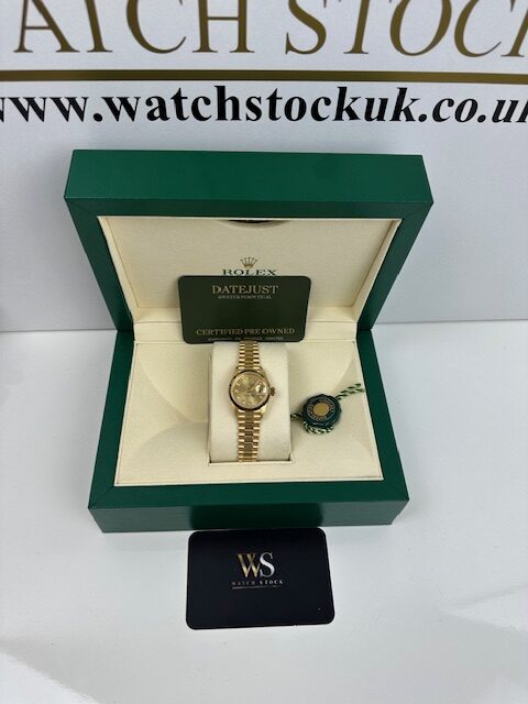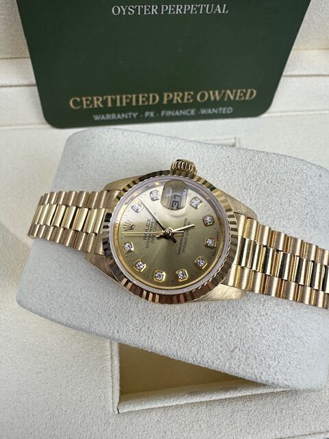 LADIES DATEJUST JUST A SUPERB ROLEX FULL 18K YELLOW GOLD ON A PRESIDENT BRACELET, FACTORY CHAMPAGNE BIG DIAMOND DIAL, 26MM , COMES WITH 18K FLUTED BEZEL
