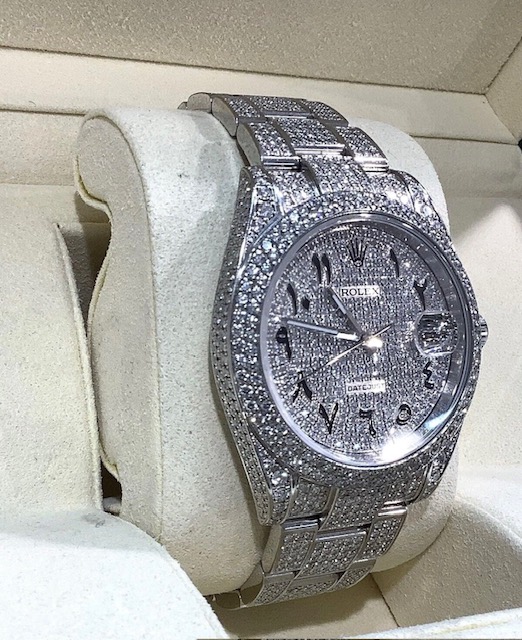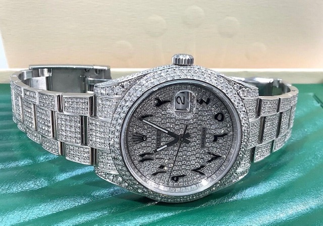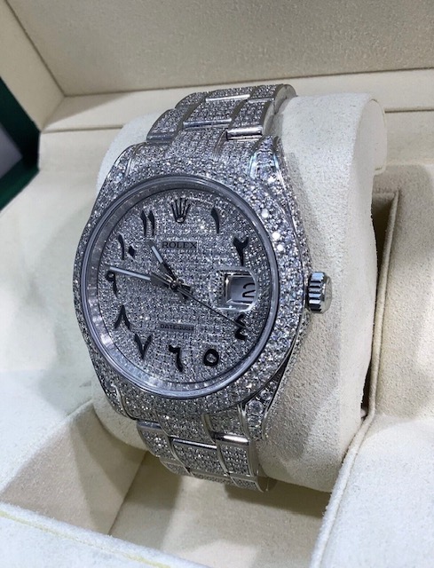 SUPER CONDITION , FULL DIAMOND CUSTOM SET WATCH DATEJUST II PRESENTED WITH THE PAVE AND ARABIC NUMERAL SET DIAL DIAMOND BEZEL SHOULDERS ETC