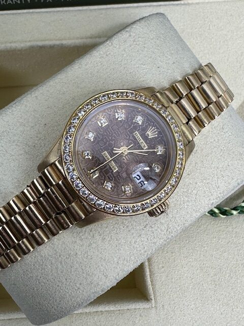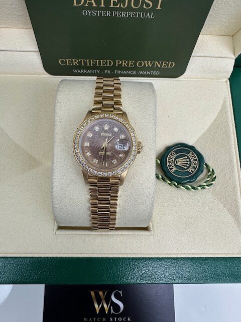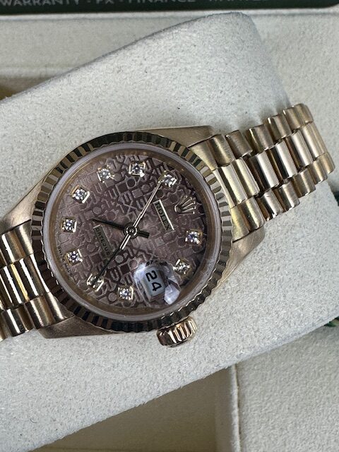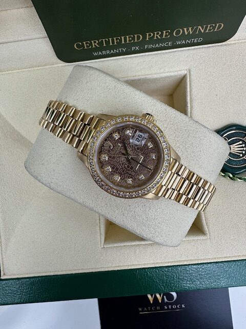 LADIES 79178 DATEJUST A SUPERB ROLEX FULL YELLOW GOLD ON A PRESIDENT BRACELET, ROLEX FACTORY CHOCOLATE SUNDUST JUBILEE DIAMOND DIAL, 26MM, COMES WITH FLUTED BEZEL OR VARIOUS STONE SET BEZELS OPTIONAL