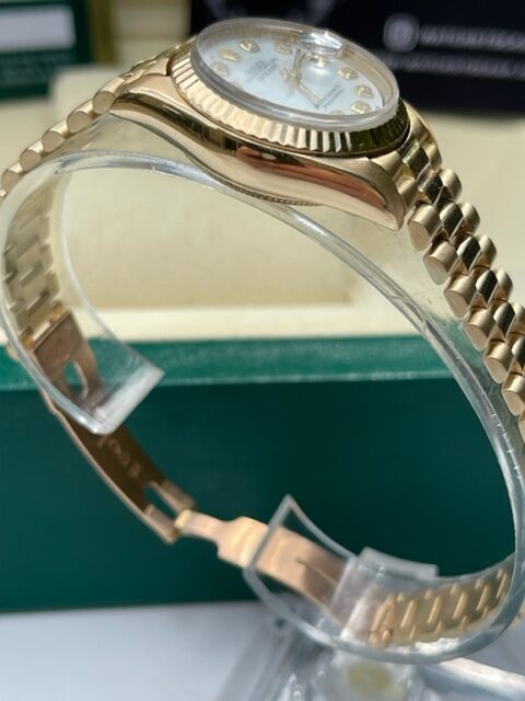 LADIES CUSTOM DATEJUST A SUPERB ROLEX FULL YELLOW GOLD ON A PRESIDENT BRACELET, MOTHER OF PEARL CUSTOM DIAL, 26MM, FLUTED BEZEL