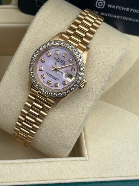 LADIES DATEJUST A SUPERB ROLEX FULL YELLOW GOLD ON A PRESIDENT BRACELET, CUSTOM MOTHER OF PEARL CZ DIAL CHOICE OF COLOURS, 26MM, STONE CZ BEZEL