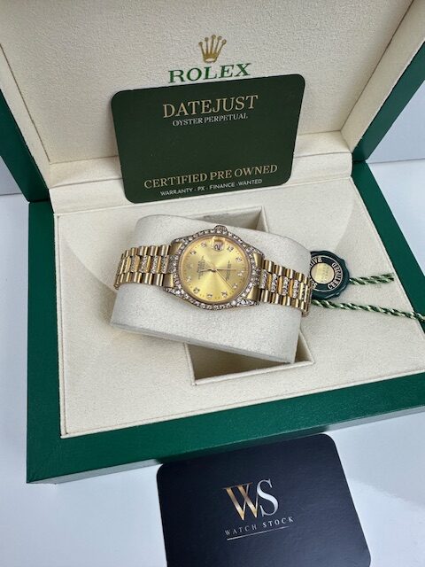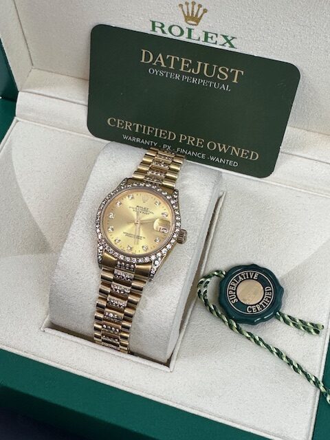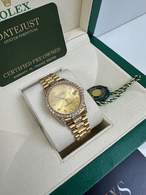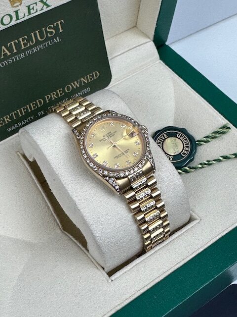 ROLEX CUSTOM DIAMOND SET DATEJUST 68278 18K 31mm MIDSIZE, PRESIDENT BRACELET , STUNNING CHAMPAGNE DIAL ,DIAMOND BEZEL, SHOULDERS AND PRESIDENT BRACELET